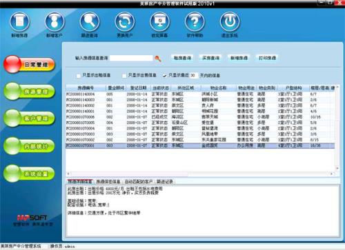 1. 房源管理:点击主窗口左侧的”房源管理” →”房源管理”按钮,打开房源管理窗口,在此窗口中可以对房源进行添加、修改、删除、查询、导出、打印等,还可对每个房源进行客户自动匹配。 对房源的添加方式如同在”日常管理”中的添加方式一样。在房源管理中点选某个房源后,在此窗口下半部分的”自动匹配的客户”中将显示与之匹配的客户。