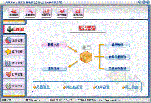 美萍库存管理系统是一款专业的库存管理软件,其中包含货品进货、出货管理系统 ,仓库管理系统,报表系统等子模块。软件界面设计简洁, 美观,其人性化的软件流程,使普通用户不需培训也能很快掌握软件操作使用方法,上手极易。强大报表与集成查询功能是本软件的更大特色,所有功能在用户需要的使用地方自然体现,不用打开多个窗口重复查询。美萍库存软件广泛适用于公司企业,商场,超市,门店等用于企业库存管理系统, 超市库存管理系统,仓库库存管理系统,是您企业进行信息化管理的强大工具