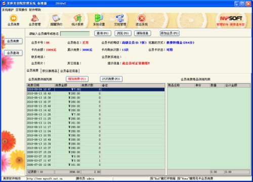 会员消费:对会员消费情况进行录入,自动完成累计积分,消费打折。也可以增加会员消费商品的详细信息。
