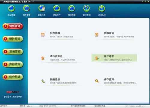 系统设置:进行商品管理、客户管理、会员管理、员工管理、操作员管理、数据库维护、修改密码等操作。